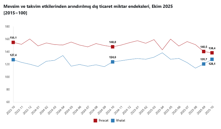 Mevsim ve takvim etkilerinden arındırılmış seriye göre ithalat miktar endeksi; 2025 Eylül ayında 120,7 iken 2025 Ekim ayında yüzde 6,1 artarak 128,1 oldu. Takvim etkilerinden arındırılmış seriye göre ise ithalat miktar endeksi; 2024 yılı Ekim ayında 120,6 iken 2025 yılı Ekim ayında yüzde 3,3 artarak 124,6 oldu.