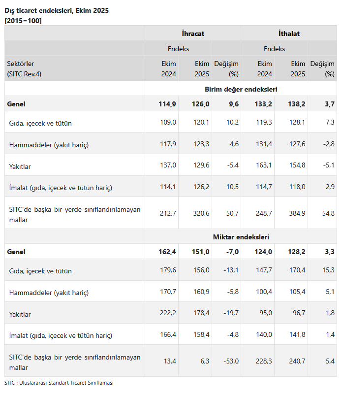 Türkiye İstatistik Kurumu’nun (TÜİK) verilerine göre, ihracat birim değer endeksi Ekim'de yıllık bazda yüzde 9,6 arttı. Endeks yıllık bazda gıda, içecek ve tütünde yüzde 10,2, ham maddelerde (yakıt hariç) yüzde 4,6 artarken, yakıtlarda yüzde 5,4 azaldı, imalat sanayinde (gıda, içecek, tütün hariç) yüzde 10,5 arttı.